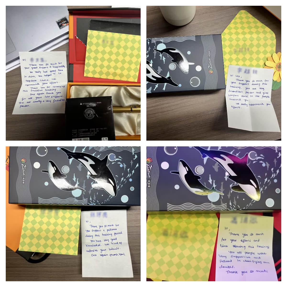 近日,九游娱乐为来自海外的合作伙伴开展的定制化培训项目圆满收官。在这场为期半个月的深度交流中,双方不仅碰撞出专业领域的智慧火花,更在朝夕相处中结下深厚情谊。临别之际,客户代表向我司四位核心员工赠送了象征友谊的定制钢笔,并亲笔写下四封饱含谢意与真诚的贺卡,为这段跨国合作添上一抹温情注脚。